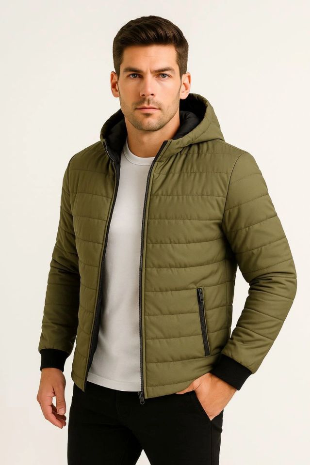 Erkek Şişme Kapüşonlu Fermuarlı Mont Su Itici Kapitone Astarlı Kumaş Cepli Kışlık Rahat Kalıp - Haki
