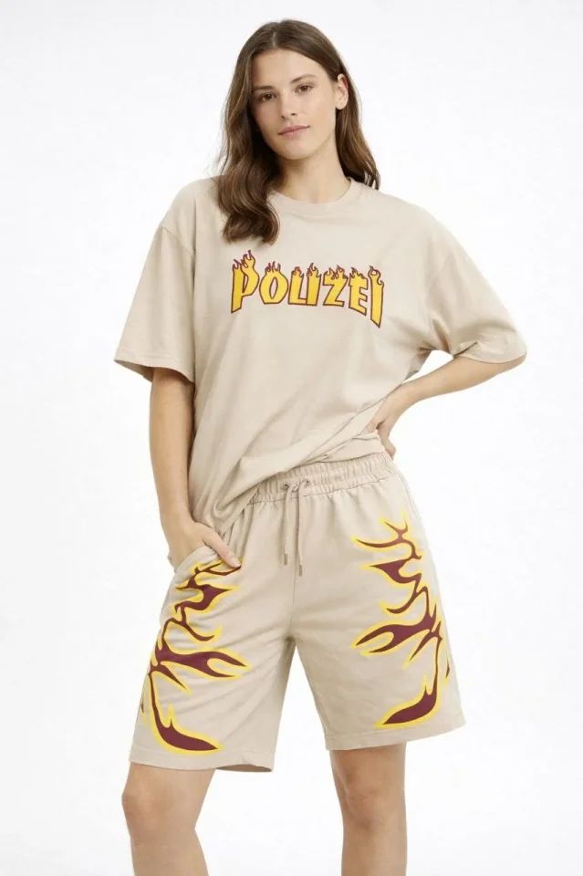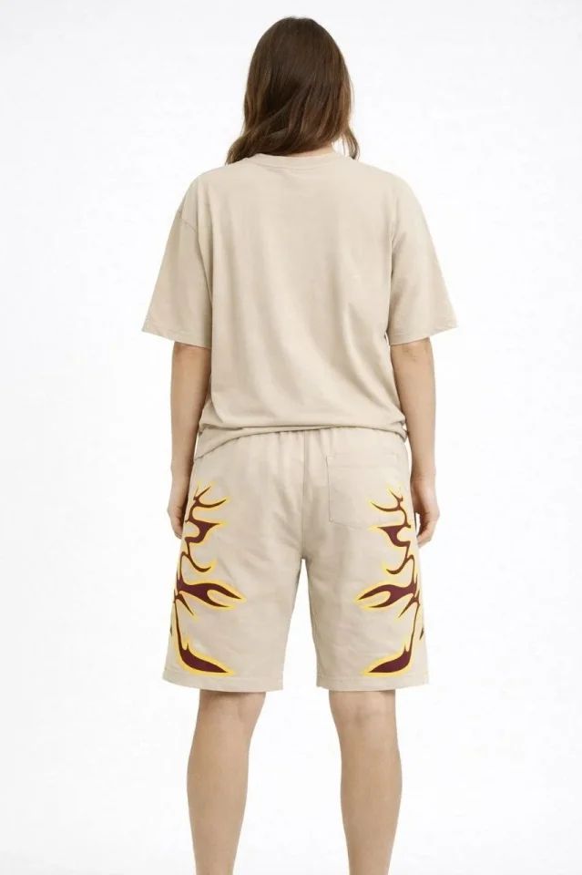 Bej Oversize Baskılı Tişört Şort Takım Cepli Şort Yazlık Rahat Günlük Kombin - Bej