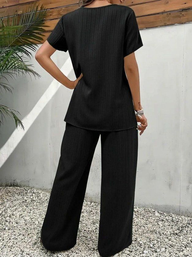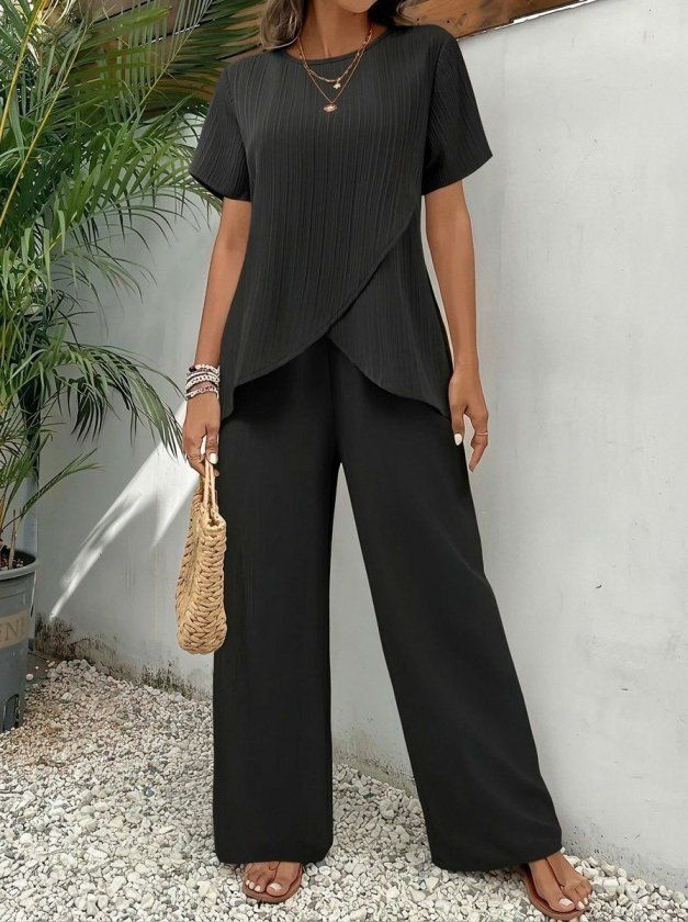 Kadın Kısa Kollu Bisiklet Yaka Asimetrik Kesim Detaylı Bürümcük Bluz Ve Pantolon Ikili Takım