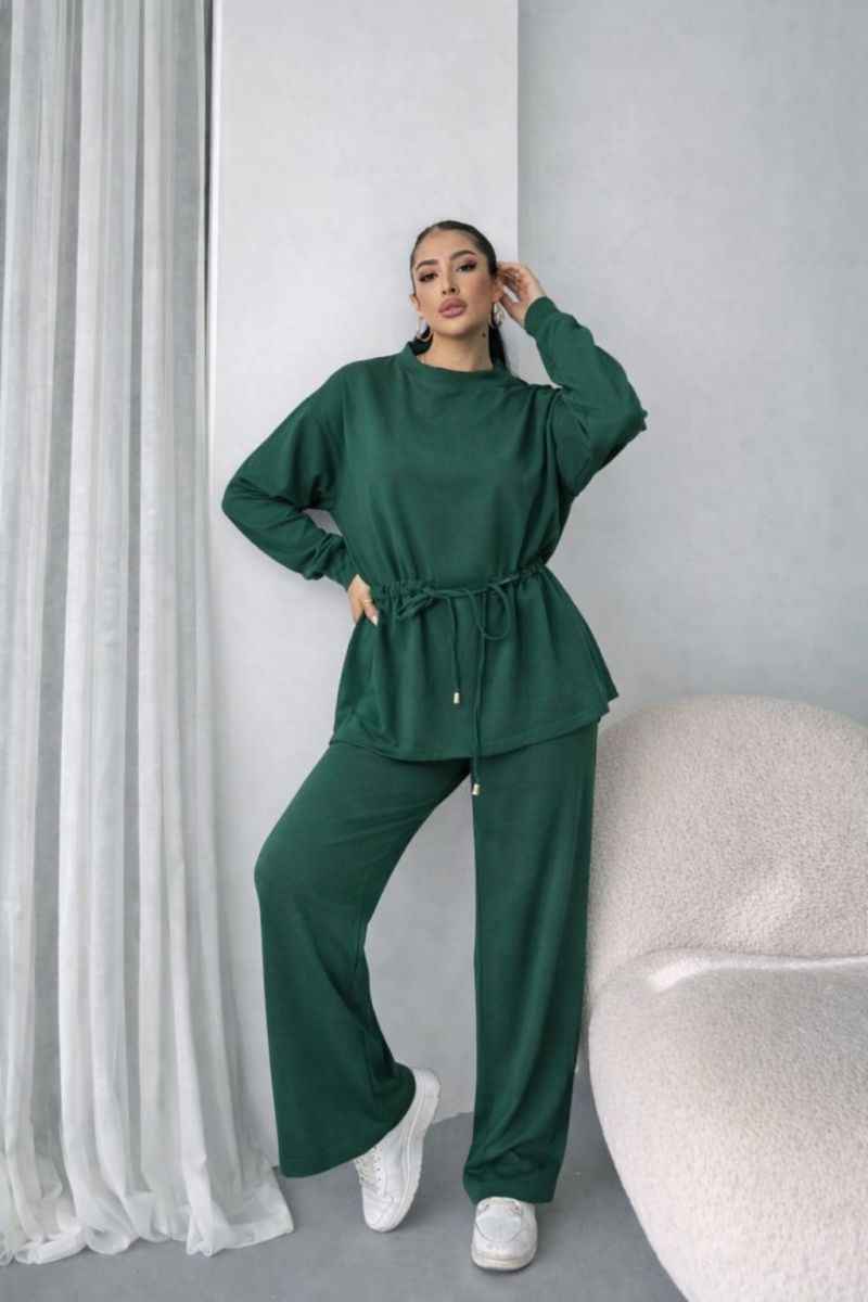 Kadın Uzun Kollu Bisiklet Yaka Belden Büzgülü Bağcıklı Viskon Iki Iplik Bluz Ve Pantolon Ikili Takım