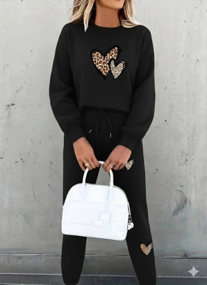 Kadın Uzun Kollu Bisiklet Yaka Kalp Desenli şardonlu üç Iplik Bluz Ve Pantolon Ikili Takım