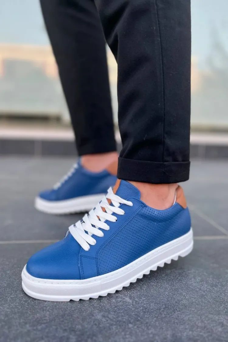 Zengin mavi tonu ve topuk kısmındaki taba rengi deri detayıyla modern bir kontrast oluşturan bu model, %100 deri kalitesini sportif bir tasarımla birleştiriyor. Yan kısımlardaki özel perfore (delikli) doku, deri kalitesini şık bir detayla tamamlarken hava sirkülasyonunu maksimize eder. Dayanıklı dikişleri ve yüksek kaliteli beyaz tabanıyla hem uzun ömürlü bir kullanım hem de her adımda üst düzey rahatlık vadeder.