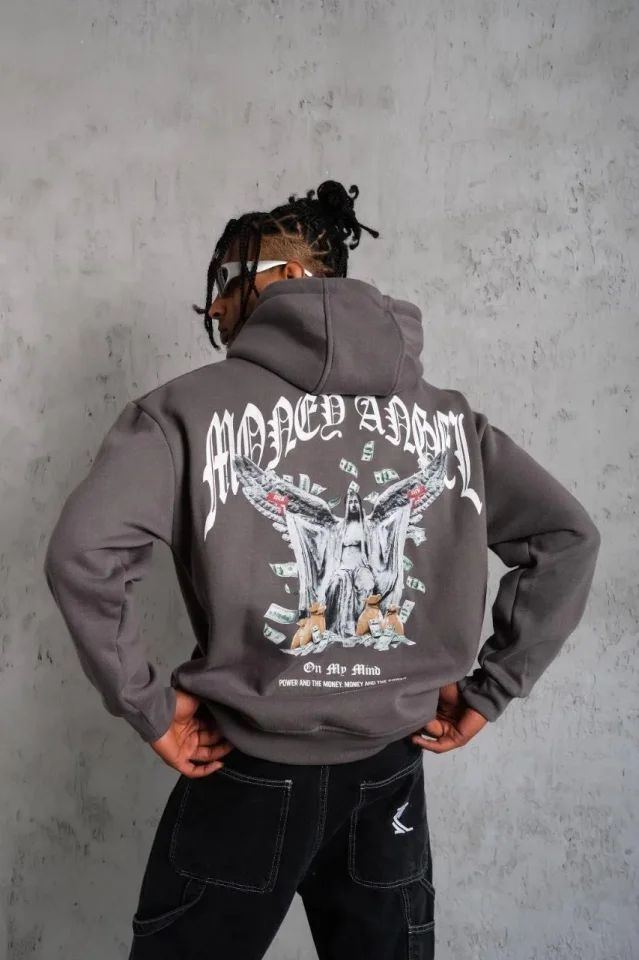 Erkek Kordon İpli Baskılı Kapüşonlu Sweatshirt - Füme
