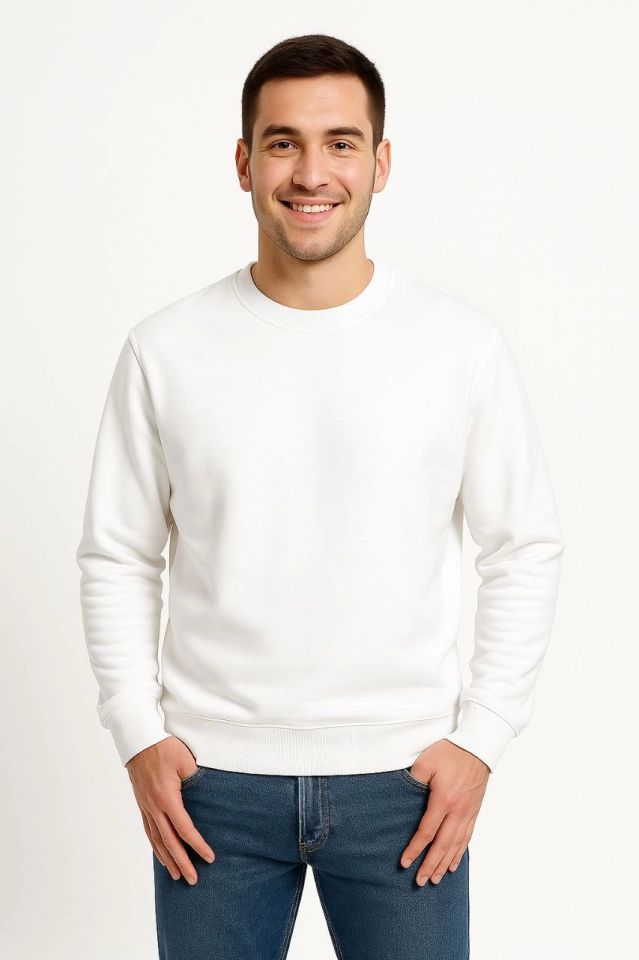 Erkek Üç İplik Düz Bisiklet Yaka SweatShirt - Beyaz