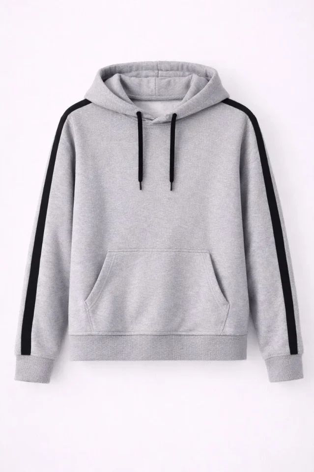 Erkek Şeritli Kapüşonlu Sweatshirt Oversize 3 Iplik Pamuklu - Gri