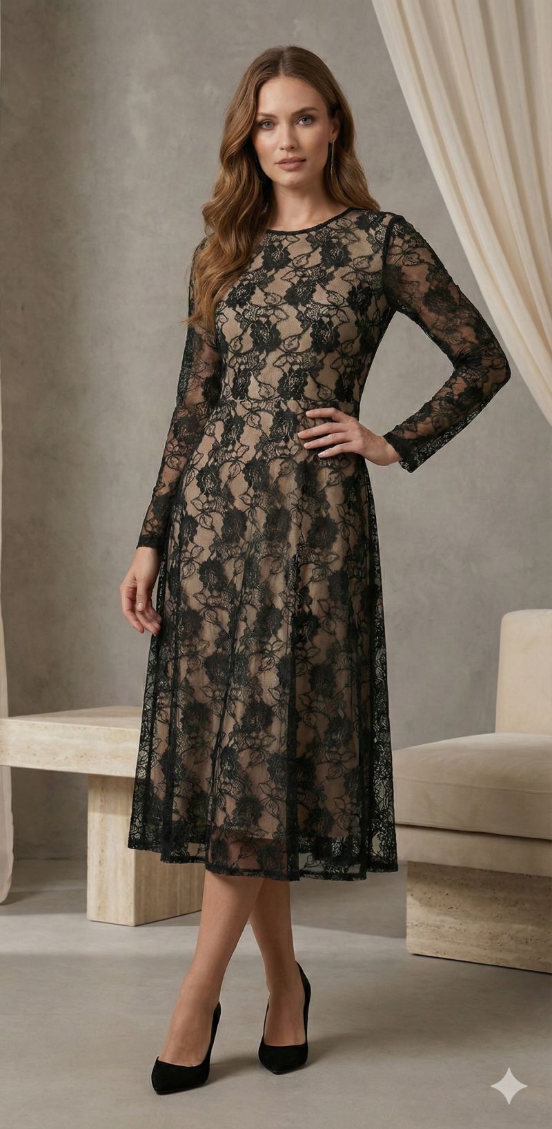 Kadın Uzun Kollu Bisiklet Yaka Dantelli Astarlı Midi Elbise