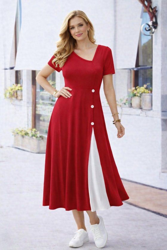 Kadın Kısa Kollu Asimetrik Yakalı Düğme Detaylı Midi Viskon Elbise