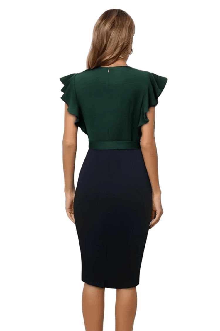 Zarafetin ve modern kesimlerin mükemmel uyumuyla tanışın. Üst kısmı asil bir zümrüt yeşili, etek kısmı ise klasik siyahın asaletiyle tasarlanan bu elbise, blok desen modasını en şık haliyle sunuyor. İthal krep kumaşının dökümlü yapısı ve beldeki kuşak detayı, vücut hatlarınızı zarifçe vurgularken; kruvaze yaka ve volanlı kol detayları romantik bir hava katıyor. Gardırobunuzun en güçlü "tek parça şıklık" adayı olmaya hazır.
