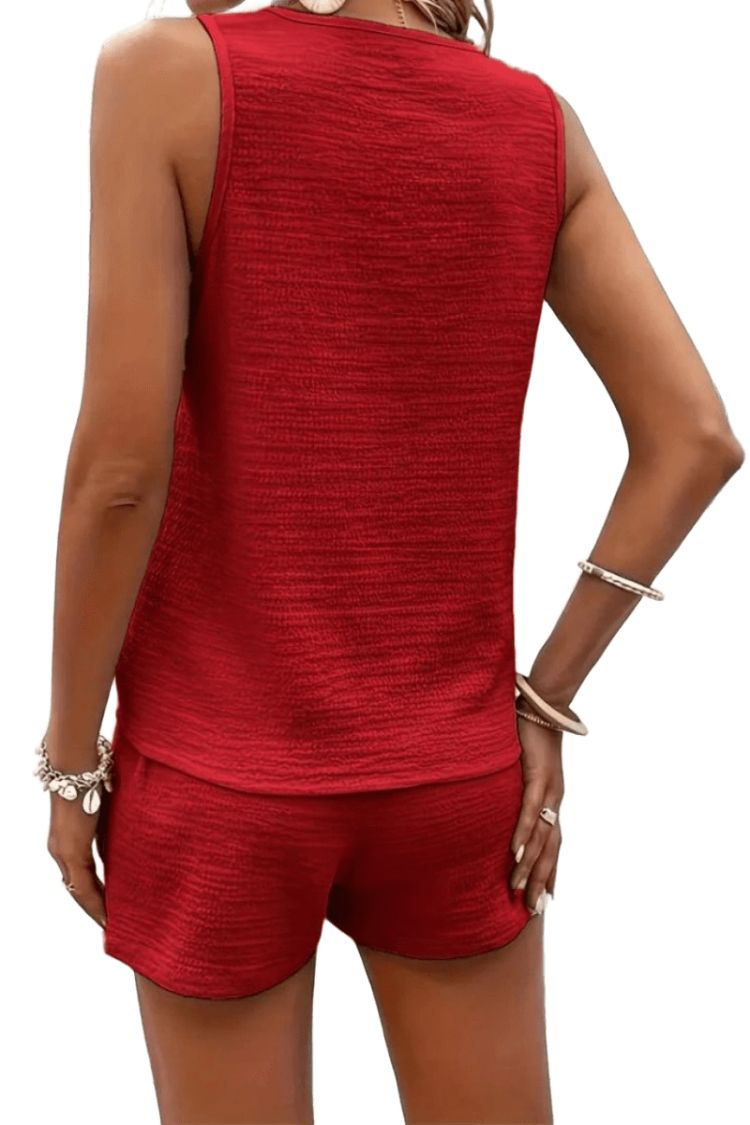 Yazın kavurucu sıcaklarında hem şık hem de bulutlar kadar hafif hissetmeye hazır mısınız? Özel bürümcük dokusu sayesinde ütü gerektirmeyen bu ikili takım, tatil valizlerinizin ve günlük şehir stilinizin vazgeçilmezi olacak. Canlı kırmızı tonuyla tüm bakışları üzerinize çekerken, önden düğmeli bluzu ve konforlu şortuyla zahmetsiz şıklığın tanımını yeniden yapacaksınız. İster plajda hasır bir şapkayla, ister şehirde sandaletlerinizle kombinleyin; gün boyu konfor sizinle.