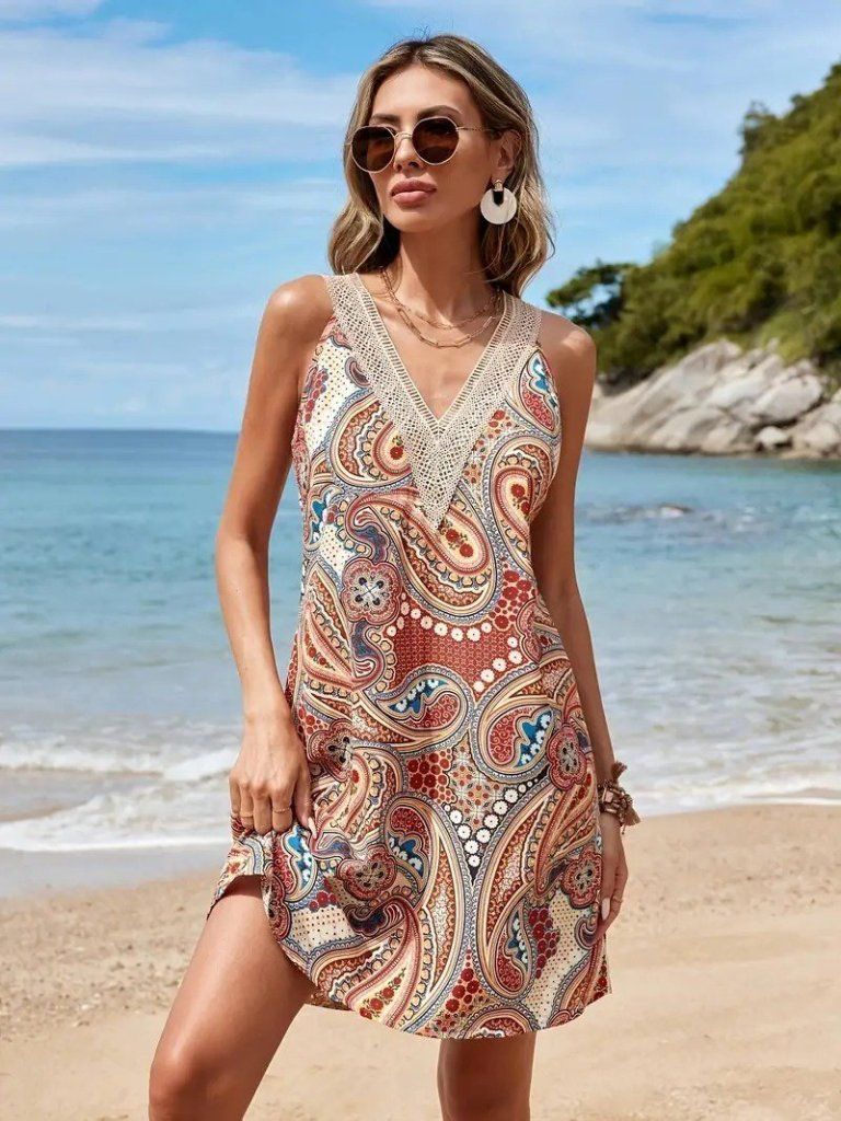 Kadın Kısa Kollu Dantel V Yakalı Desenli Süprem Elbise