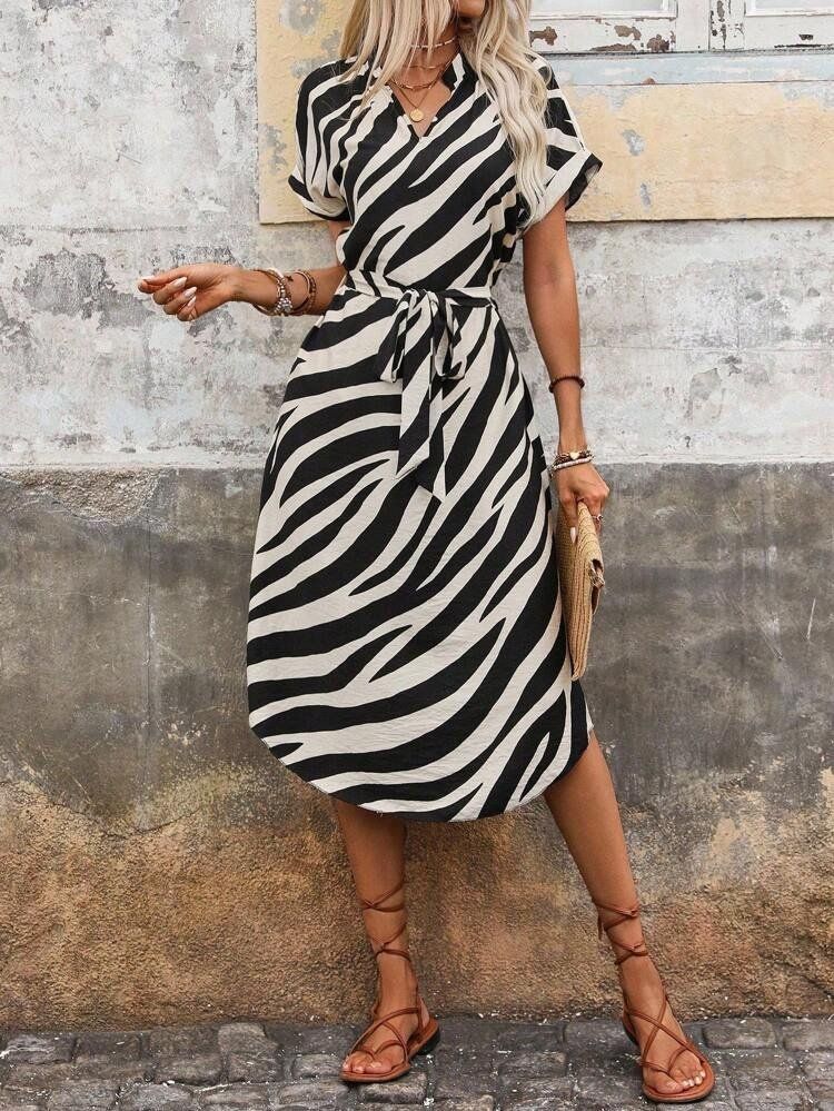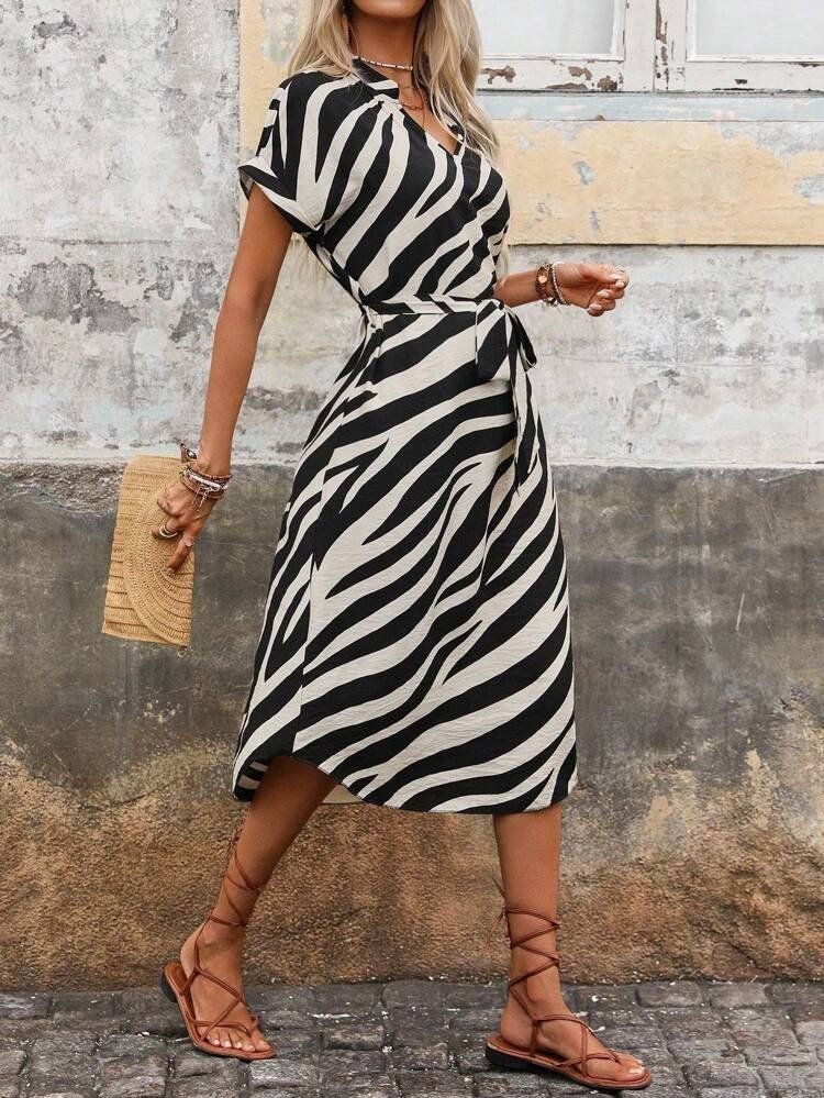 Kadın Kısa Kollu V Hakim Yakalı Zebra Desenli Midi Süprem Elbise
