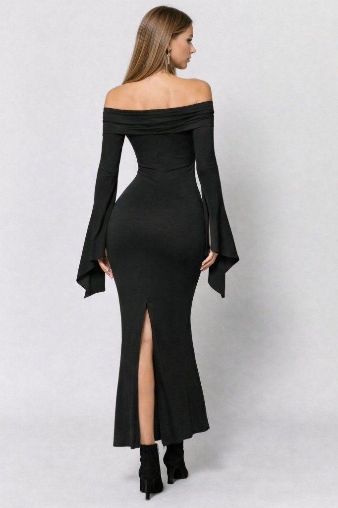 Kadın Madonna Yaka Uzun Yırtmaç Kol Detaylı Uzun Ithal Krep Elbise