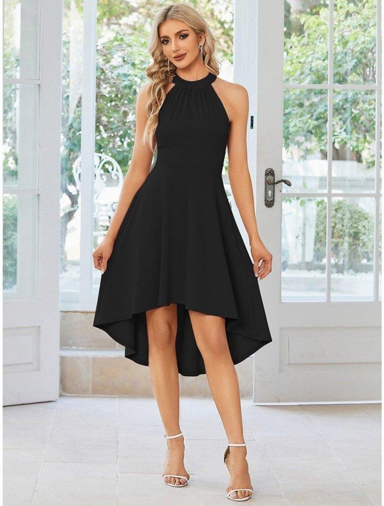 Kadın Omuzlardan Açık Boyundan Halka Detaylı Görünümlü Asimetrik Detaylı Kısa Ithal Krep Elbise