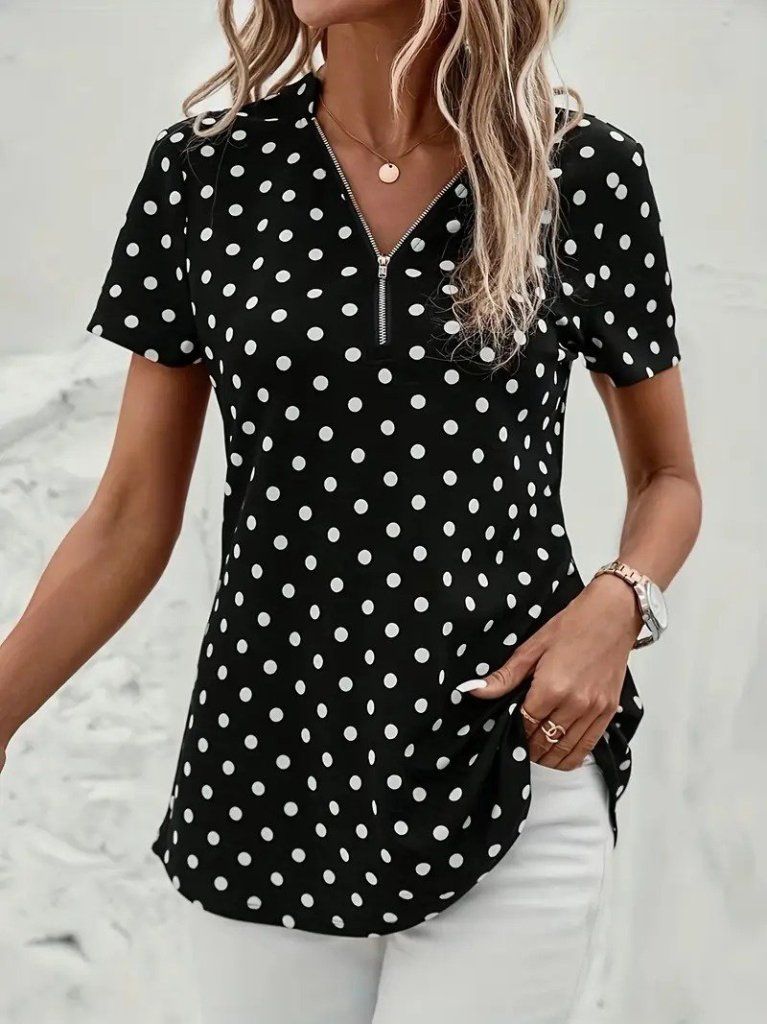 Kadın Kısa Kollu Yakadan Fermuarlı Puantiyeli Uzun Dokuma Viskon Bluz