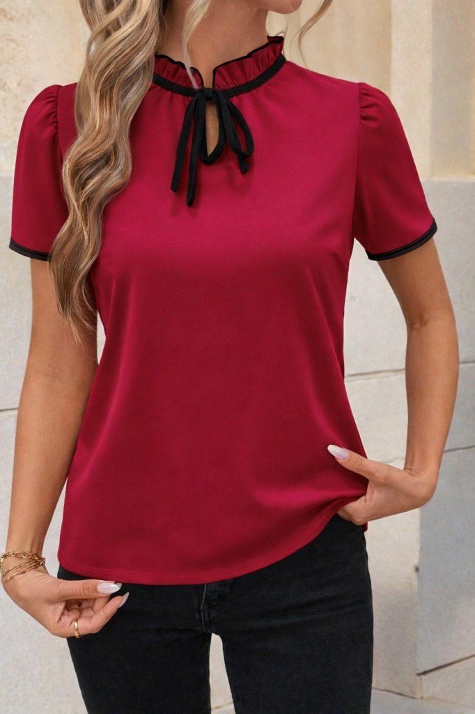 Kadın Kısa Kollu Yakası Fırfırlı Bağcıklı Janjan Krep Bluz