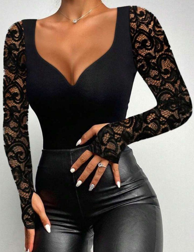 Kadın Uzun Kollu Dantelli Dekolte Detaylı Dalgıç Bluz