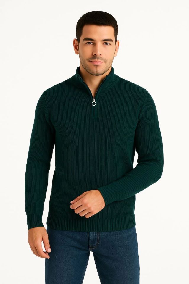 Erkek Yarım Fermuarlı Triko Kazak – Selanik Örgü, Dik Yaka, Pamuklu Dokuma, Regular Fit Uzun Kollu Kışlık Model - Haki