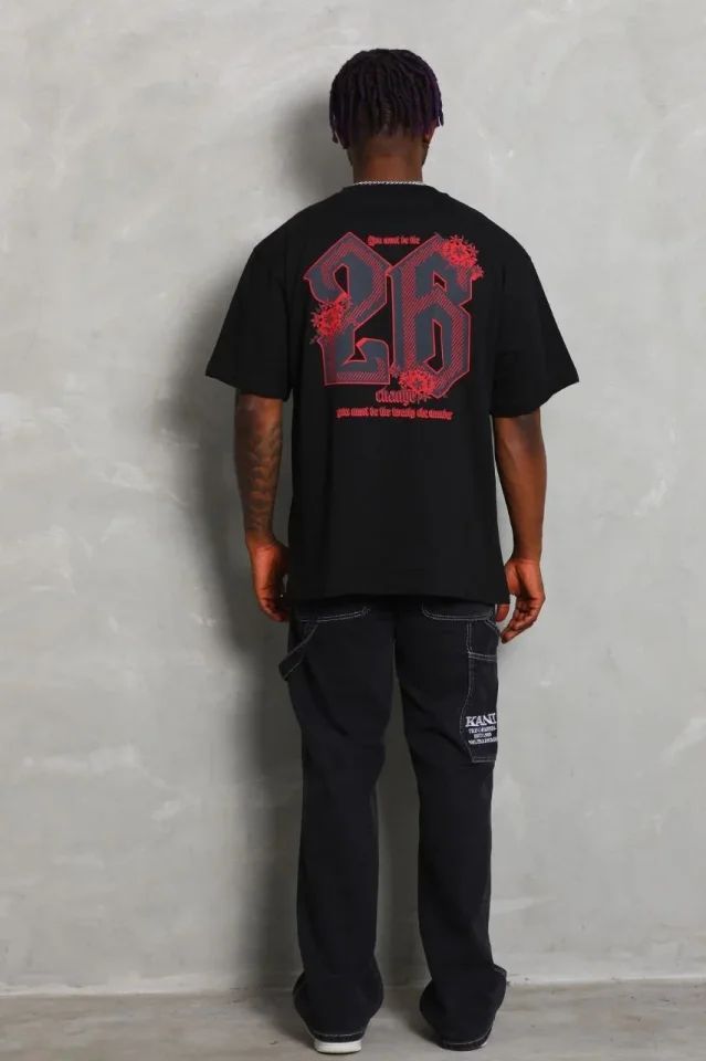 Erkek Baskılı Tişort Kısa Kol Bisiklet Yaka Ovarsize T-Shirt - Siyah