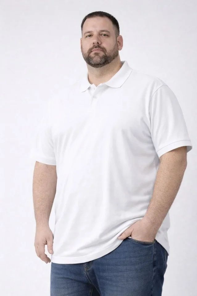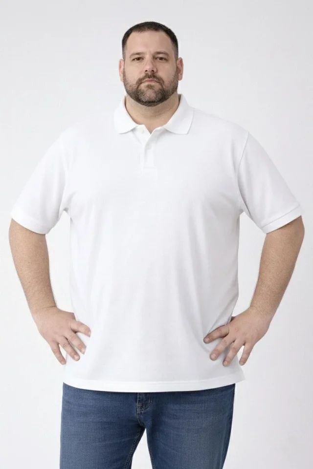 Erkek Pike Kumaş Düğmeli Yaka Battal Büyük Beden Günlük Kısa Kol Tişört T-shirt - Beyaz