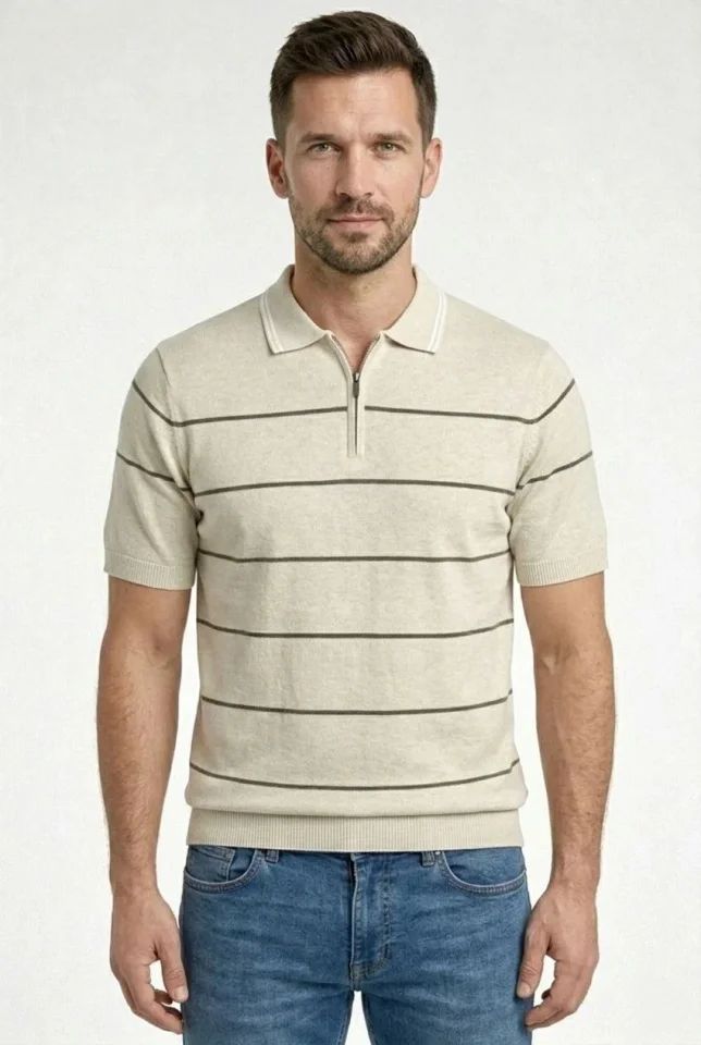 Erkek T-shirt Çizgili Triko Dokuma Kumaş Polo Yaka Yarım Fermuarlı Regular Kalıp Tişört - Bej
