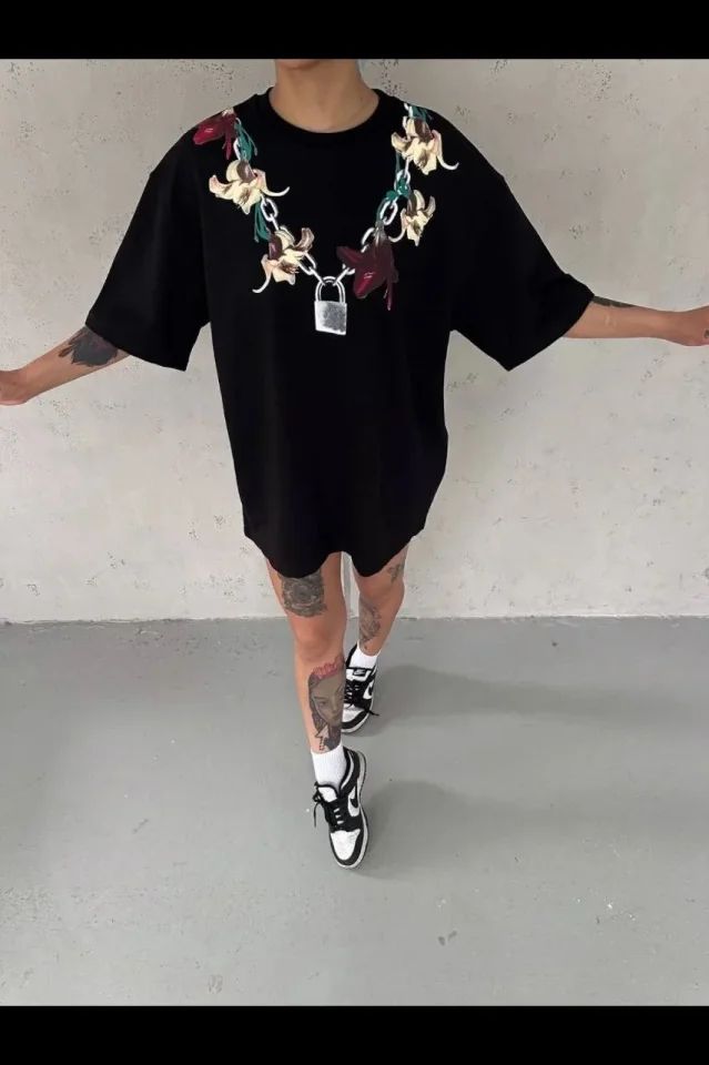 Baskılı T-Shirt Kısa Kol Bisiklet Yaka Regular Rahat Kalıp Günlük Tişört - Siyah