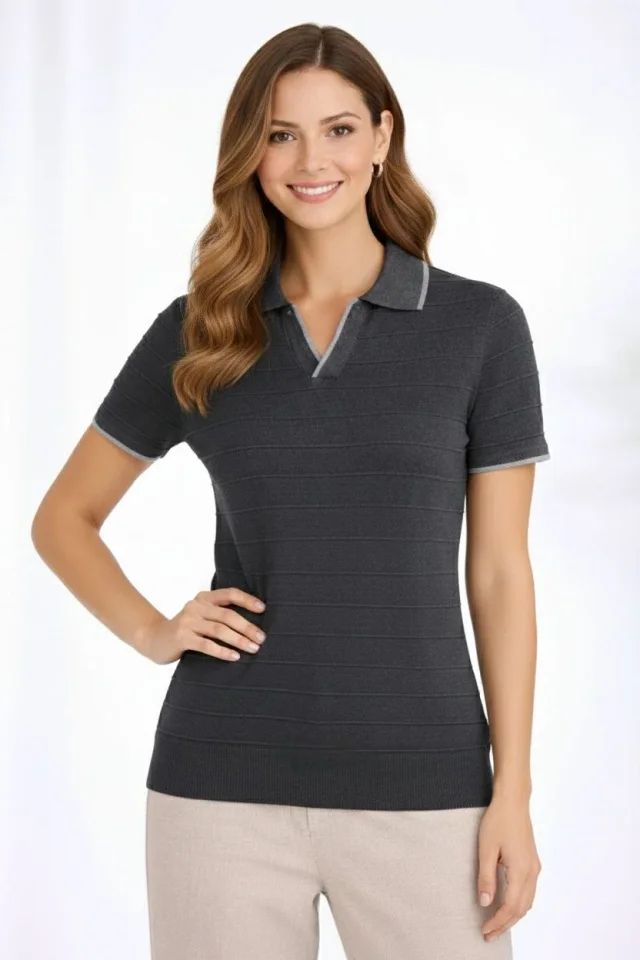 Triko Kumaş Yakalı Düğmesiz Açık Yaka Fitilli Kısa Kollu Regular Fit Tişört T-shirt - Siyah