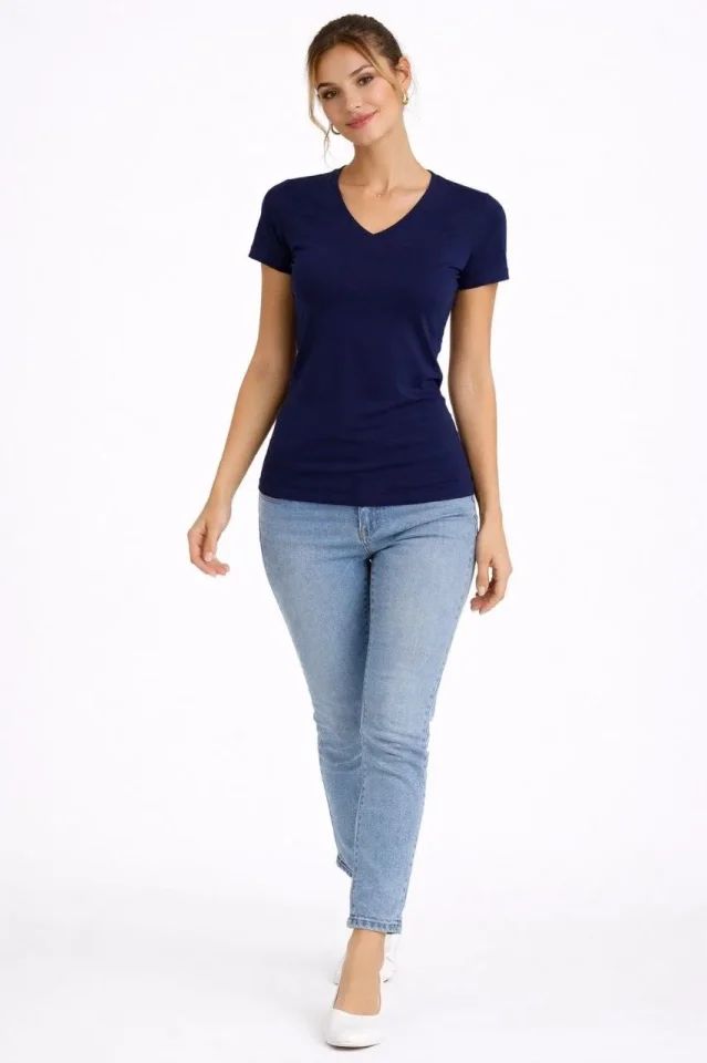 2li V Yaka Tişört – Kısa Kollu Yazlık Slim Fit Body - Lacivert - Ekru