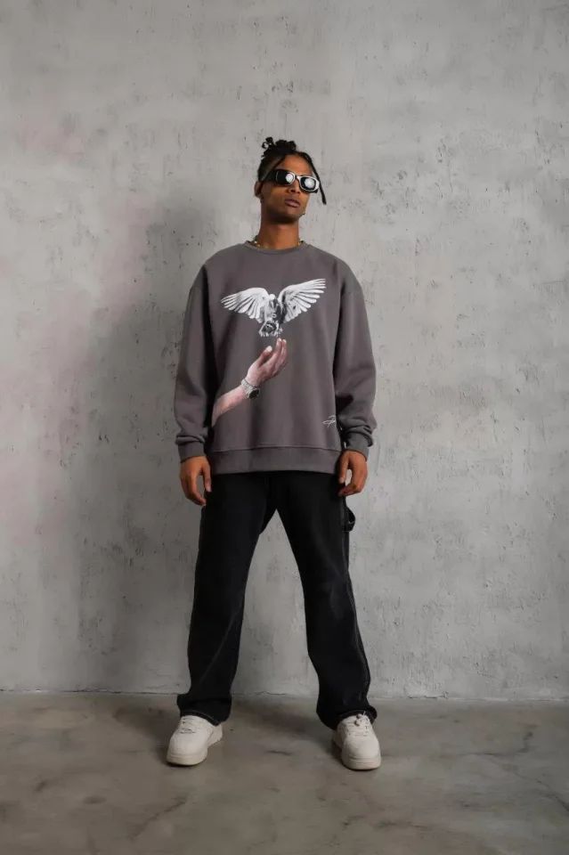 Erkek Güvercin Baskılı Sweatshirt - Gri