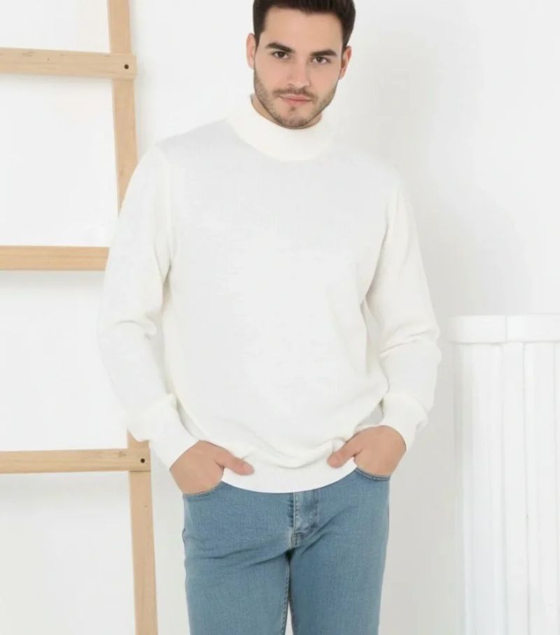 Erkek Yarım Boğaz Triko Kazak Yumuşak Dokulu Pamuklu Ince Dokuma, Uzun Kollu Rahat Regular Kalıp - Beyaz