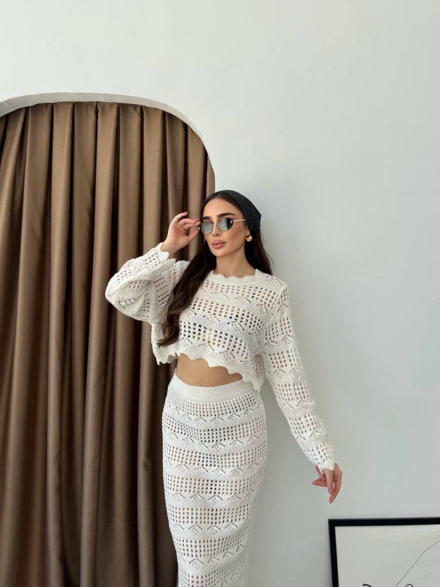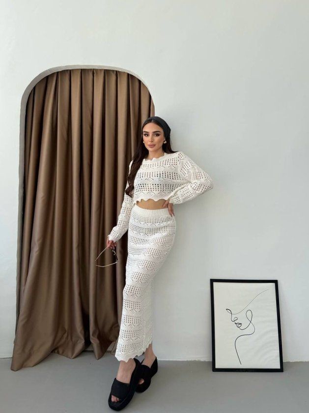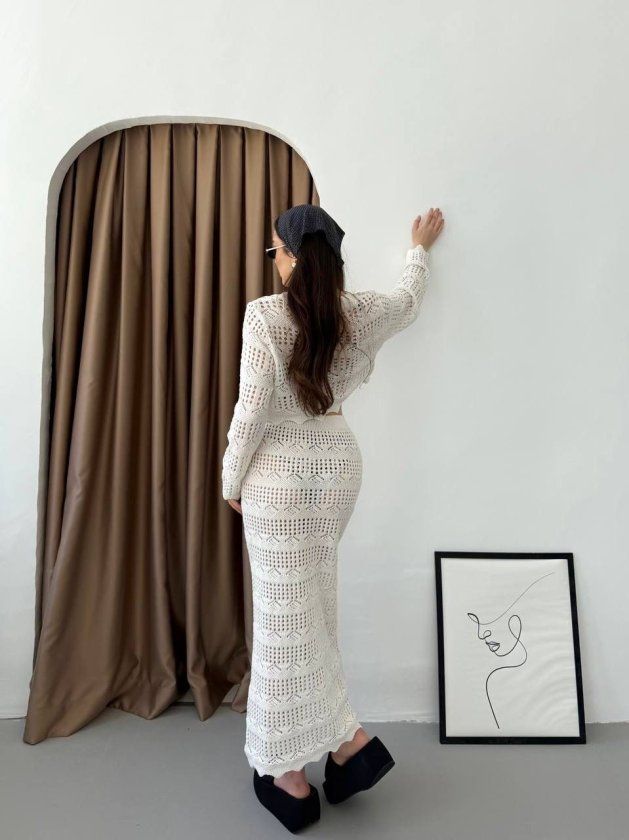Kadın Uzun Kollu Kuş Gözü Transparan Detay Triko Bluz Ve Maxi Boy Etek Ikili Takım