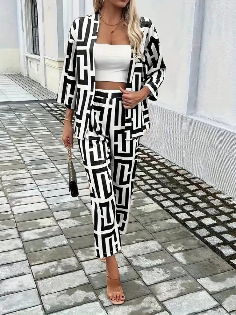 Kadın Uzun Kollu önü Açık Desenli Iki Iplik Ceket Ve Pantolon Ikili Takım