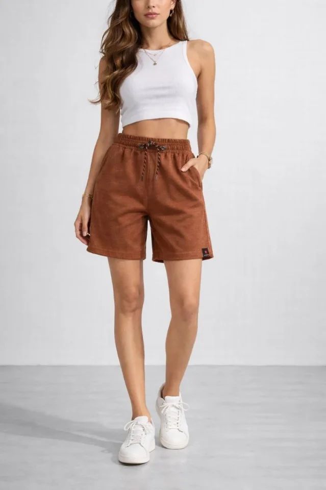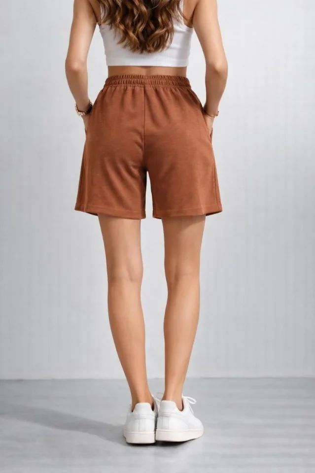 Dokuma Otoban Şort Beli Lastikli Bağcıklı, Cepli, Rahat Kesim Günlük Yazlık Şort - Kahverengi