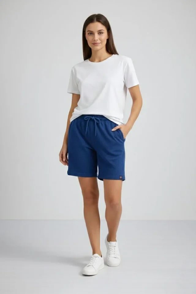 Dokuma Otoban Şort Beli Lastikli Bağcıklı, Cepli, Rahat Kesim Günlük Yazlık Şort - İndigo