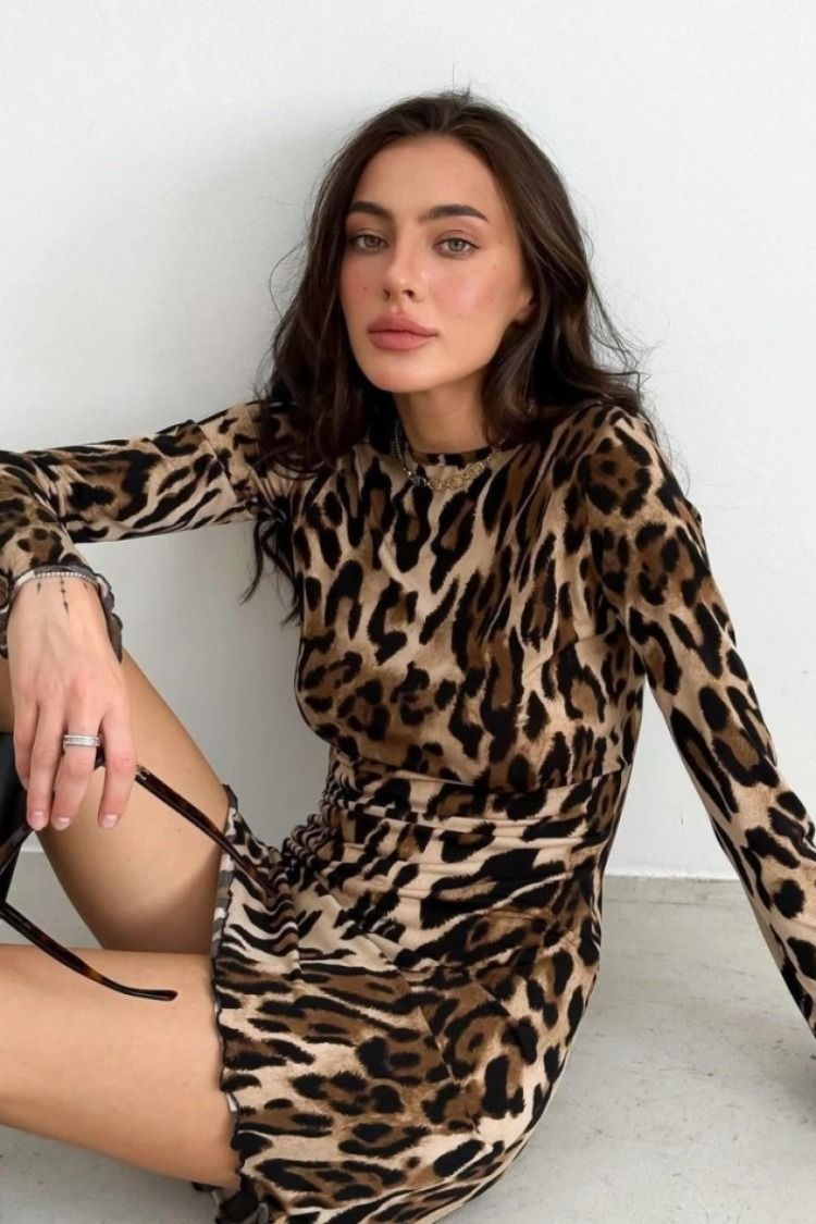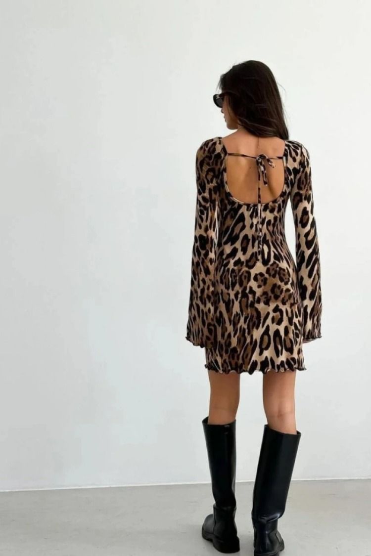 Kadın Uzun Kollu Sırtı Açık Bağlamalı Leopar Desenli Kısa Dalgıç Elbise