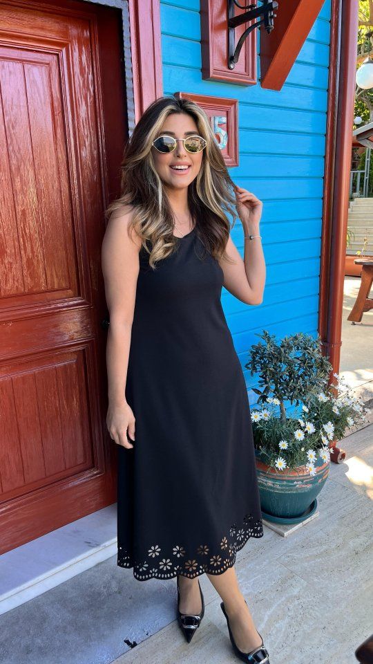 Kadın Kolsuz Etek Ucu Lazer Kesim çiçek Desenli Midi Boy Janjan Krep Elbise