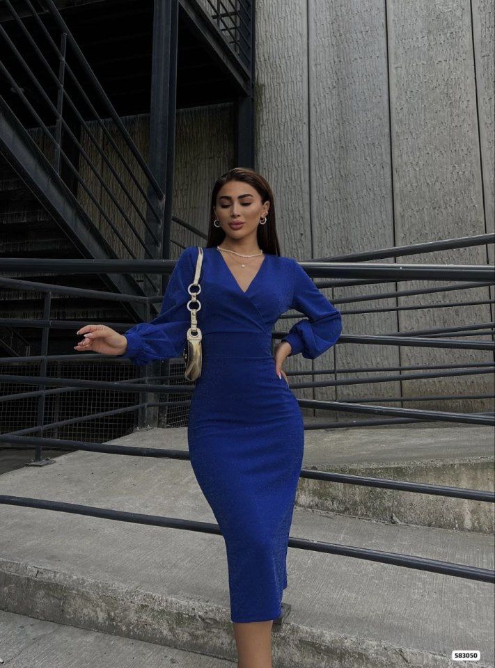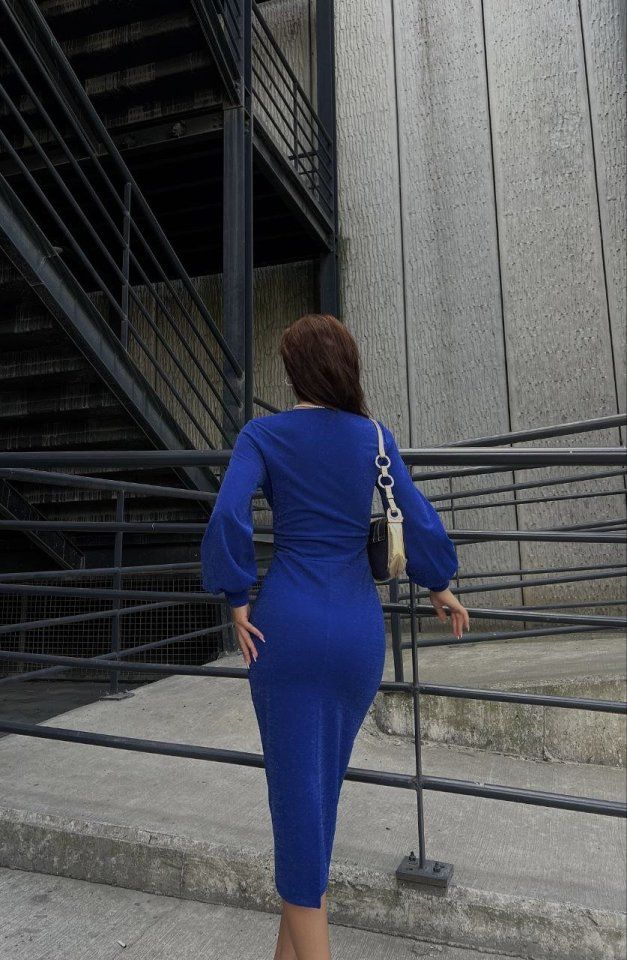 Kadın Kruvaze Yaka Balon Kol Simli Krep Kumaş Midi Boy Elbise