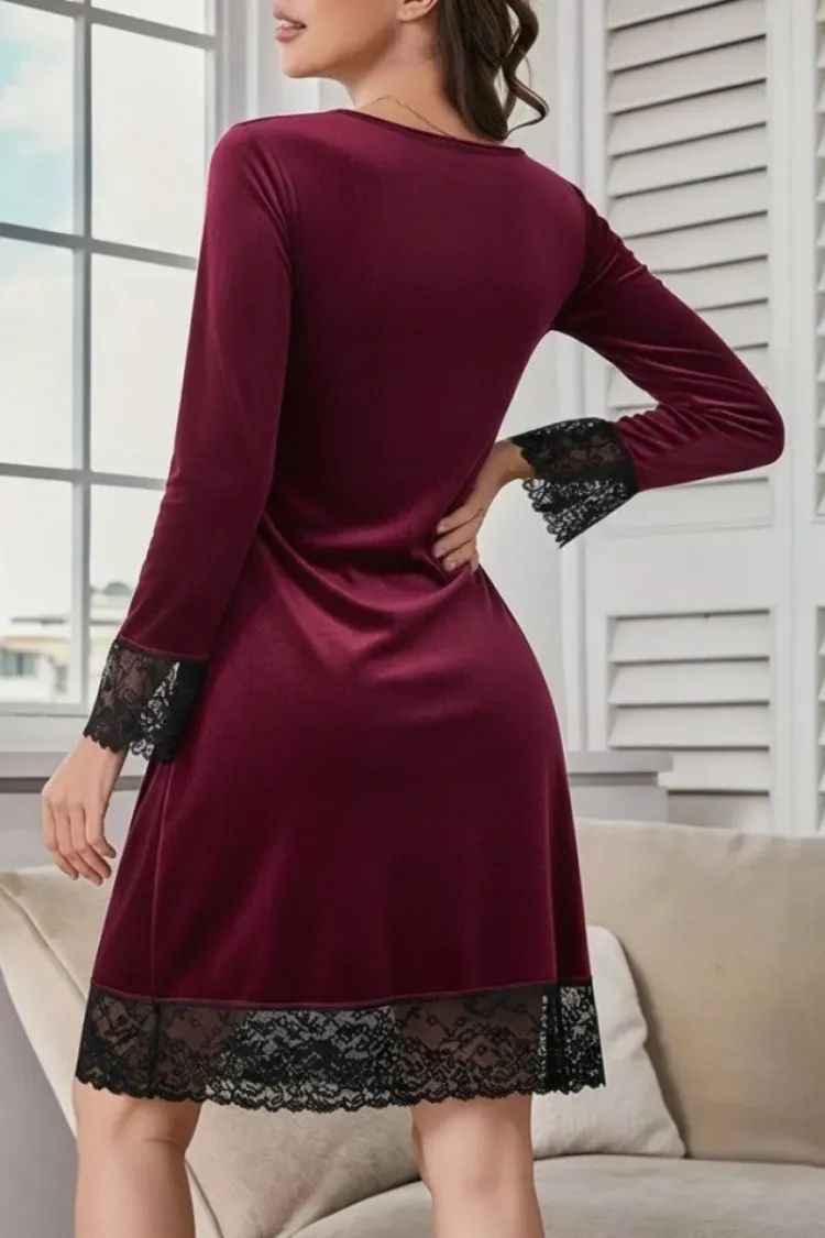 Kadın Uzun Kollu V Dantel Yakalı Mini Kadife Elbise
