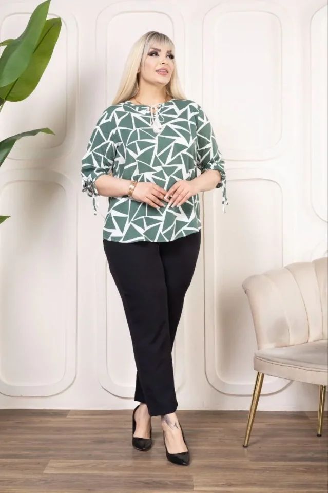 Desenli Püsküllü Viskon Bluz Bebe Yaka Kısa Kollu Big Size Rahat Kesim - Desenli