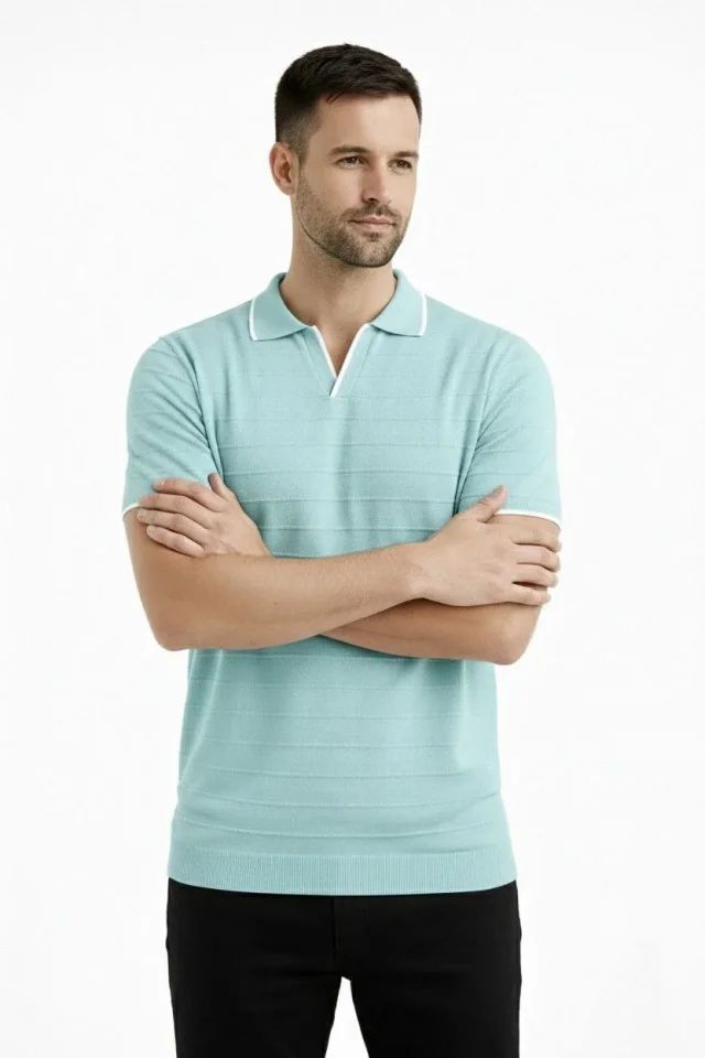 Erkek Kısa Kol Fitilli Triko Yakalı Düğmesiz T-shirt 2li Set Siyah-Mint Yeşili