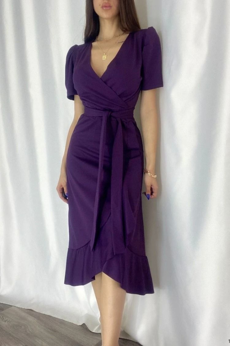 Kadın Kruvaze Yaka Midi Boy Kuşaklı Krep Elbise (120 cm)