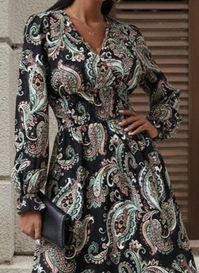 Kadın Uzun Kollu Kruvaze Yaka Beli Lastikli Uzun Desenli Maxi Elbise