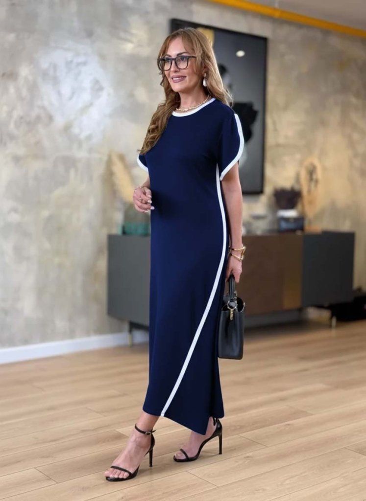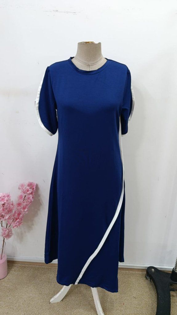Kadın Kısa Kollu Bisiklet Yaka çift şerit Renk Detaylı Asimetrik Kesim Viskon Iki Iplik Elbise