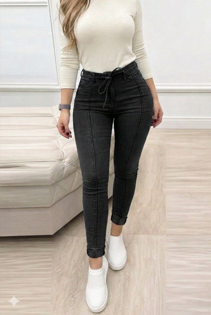 Kadın Yüksek Bel Belden Kuşaklı Yırtık Detaylı Kot Pantolon