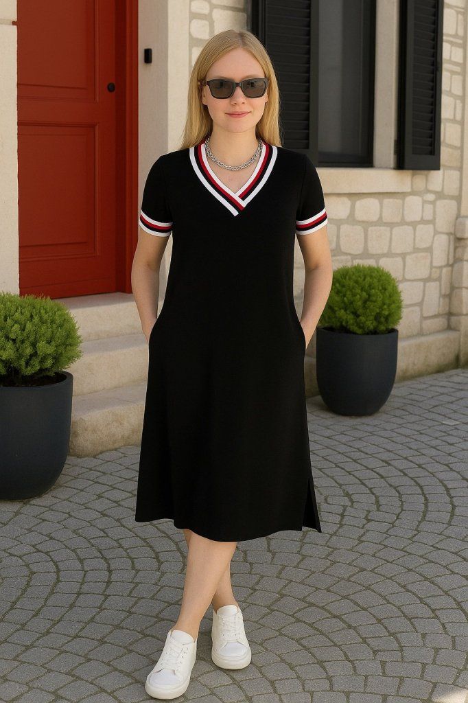 Kadın Kısa Kollu V Yaka Ribana Detay Midiboy Viskon Elbise