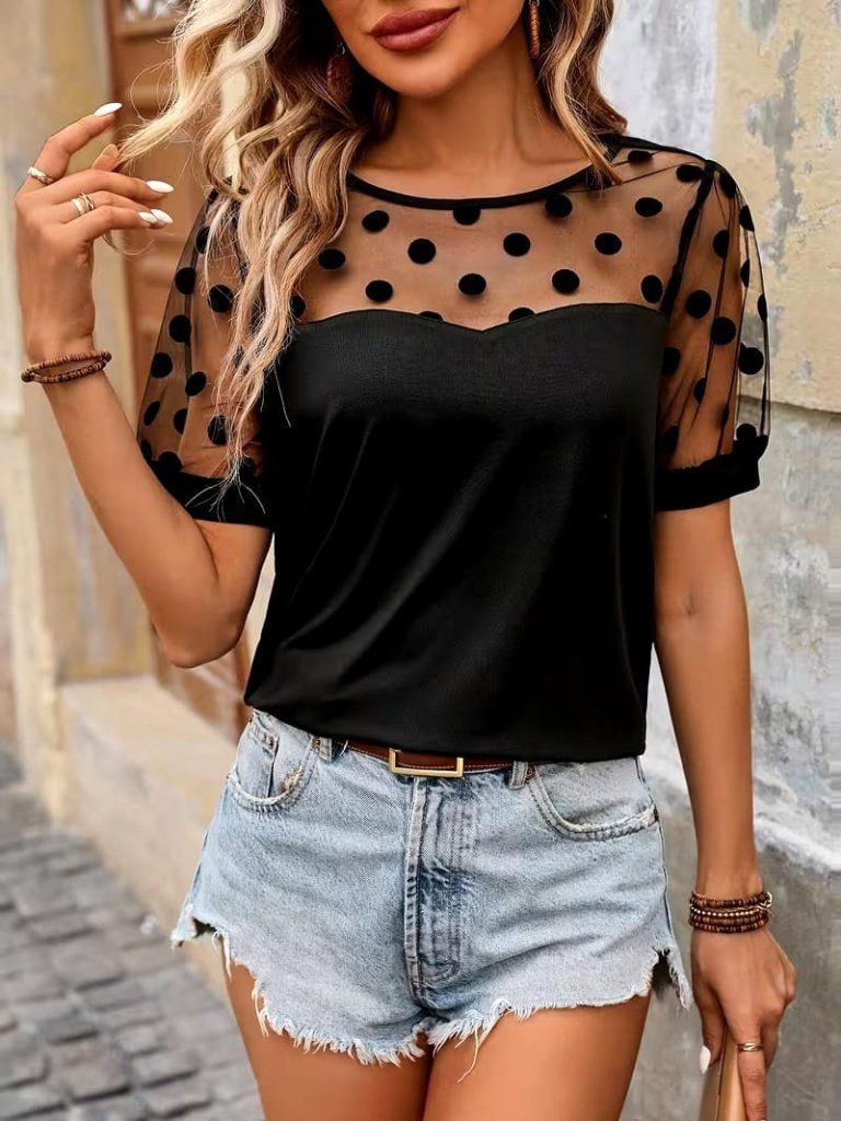 Kadın Kısa Kollu Bisiklet Yakalı Kolları Puantiyeli Viskon Bluz