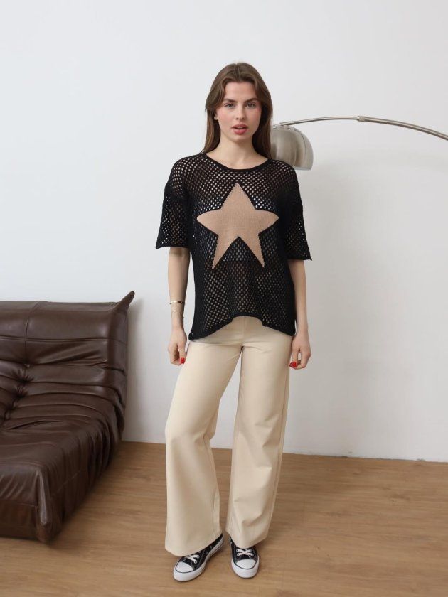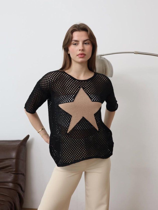Kadın önü Yıldız Desenli File Triko Bluz