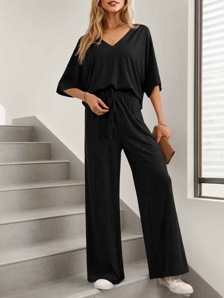 Kadın Kısa Kollu V Yakalı Viskon Bluz Ve Pantolon Ikili Takım