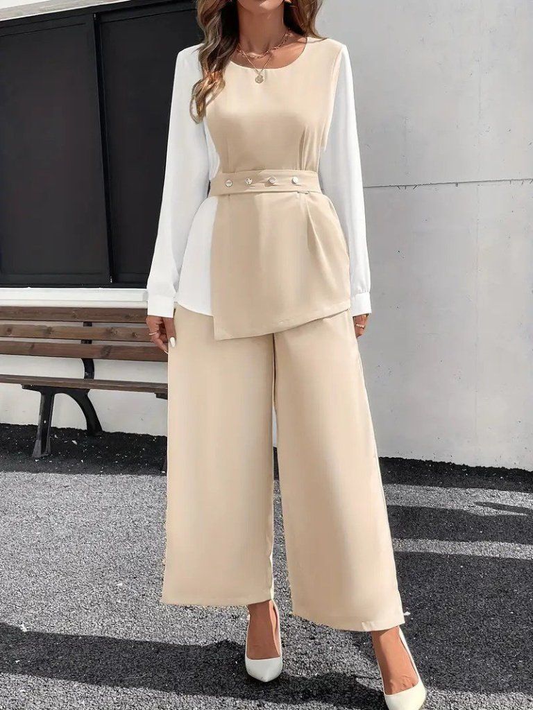 Kadın Uzun Kollu Açık Yakalı çift Renkli Kemerli Ithal Krep Ikili Takım