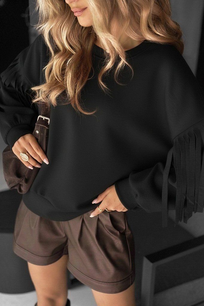 Kadın Uzun Kollu Bisiklet Yaka Kolları Püsküllü Modal Bluz