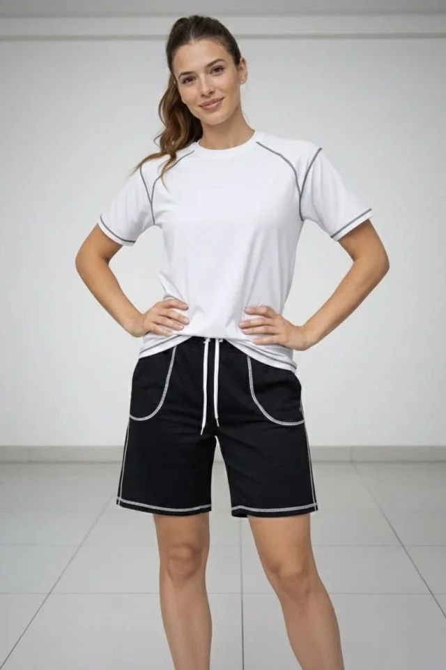 Spor Tişört Şort Takım Kontrast Dikiş Detaylı Ovarsize Rahat Kalıp - Beyaz